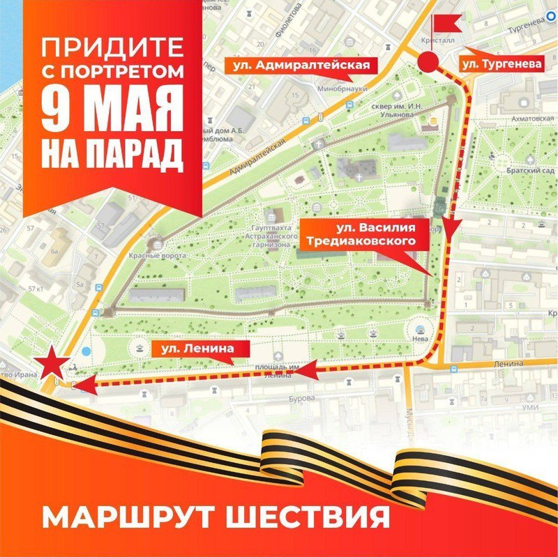 Шествие «Бессмертного полка» начнется сразу после Торжественного построения войск Астраханского гарнизона, которое начнется в 10:00. Маршрут шествия пройдет по улице Тредиаковского и повернет на улицу Ленина.