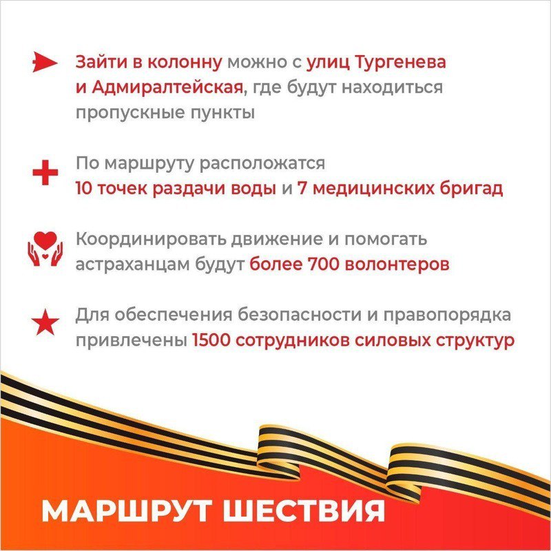 9 мая в 8:00 от бизнес-центра «Кристалл» (пересечение улиц Тредиаковского и Тургенева) начнется сбор и построение колонн. Зайти в колонну можно с улиц Тургенева, Адмиралтейской, где будут находиться пропускные пункты.