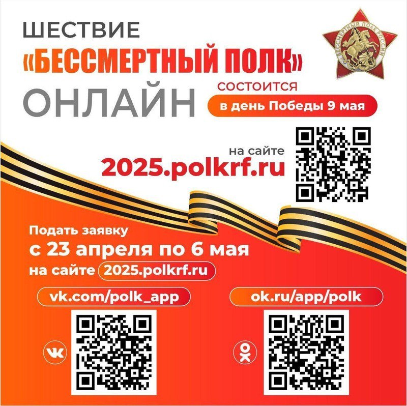 Шествие Бессмертного полка онлайн состоится в день Победы 9 мая на сайте 2025.polkrf.ru. Подать заявку на участие в акции можно с 23 апреля по 6 мая на сайте 2025.polkrf.ru и мини-приложениях ВКонтакте vk.com/polk_app и Одноклассники ok.ru/app/polk.