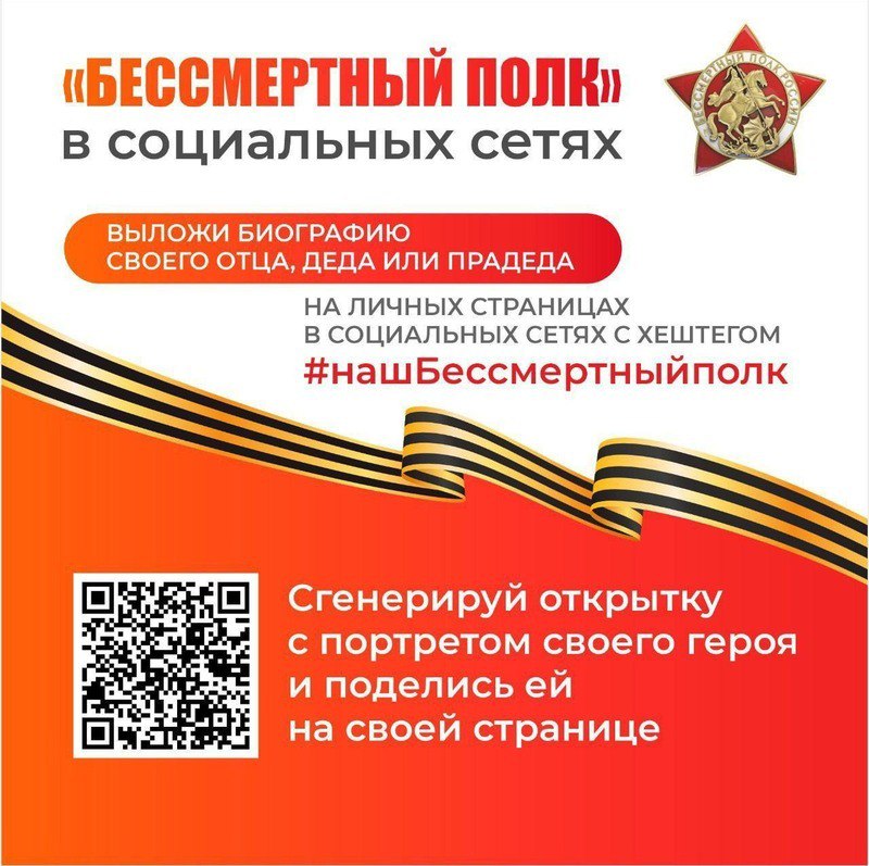 - «Бессмертный полк в социальных сетях» - Каждый может выложить биографию своего отца, деда или прадеда – как участника Великой Отечественной войны, так и труженика тыла, партизана или подпольщика, малолетнего узника нацистских концлагерей или участника специальной военной операции на личных страницах в социальных сетях с хештегом #нашБессмертныйполк. Эти истории Бессмертный полк России разместит на своих Интернет-ресурсах в течение года. Также в сообществе Бессмертного полка России в социальной сети ВКонтакте https://vk.com/polk_russia пользователи смогут сгенерировать открытку с портретом своего героя и поделиться ей на своей странице. Кроме того, в День Победы предлагается аватары личных страниц в социальных сетях заменить на портреты героев своих семей из личного архива.
