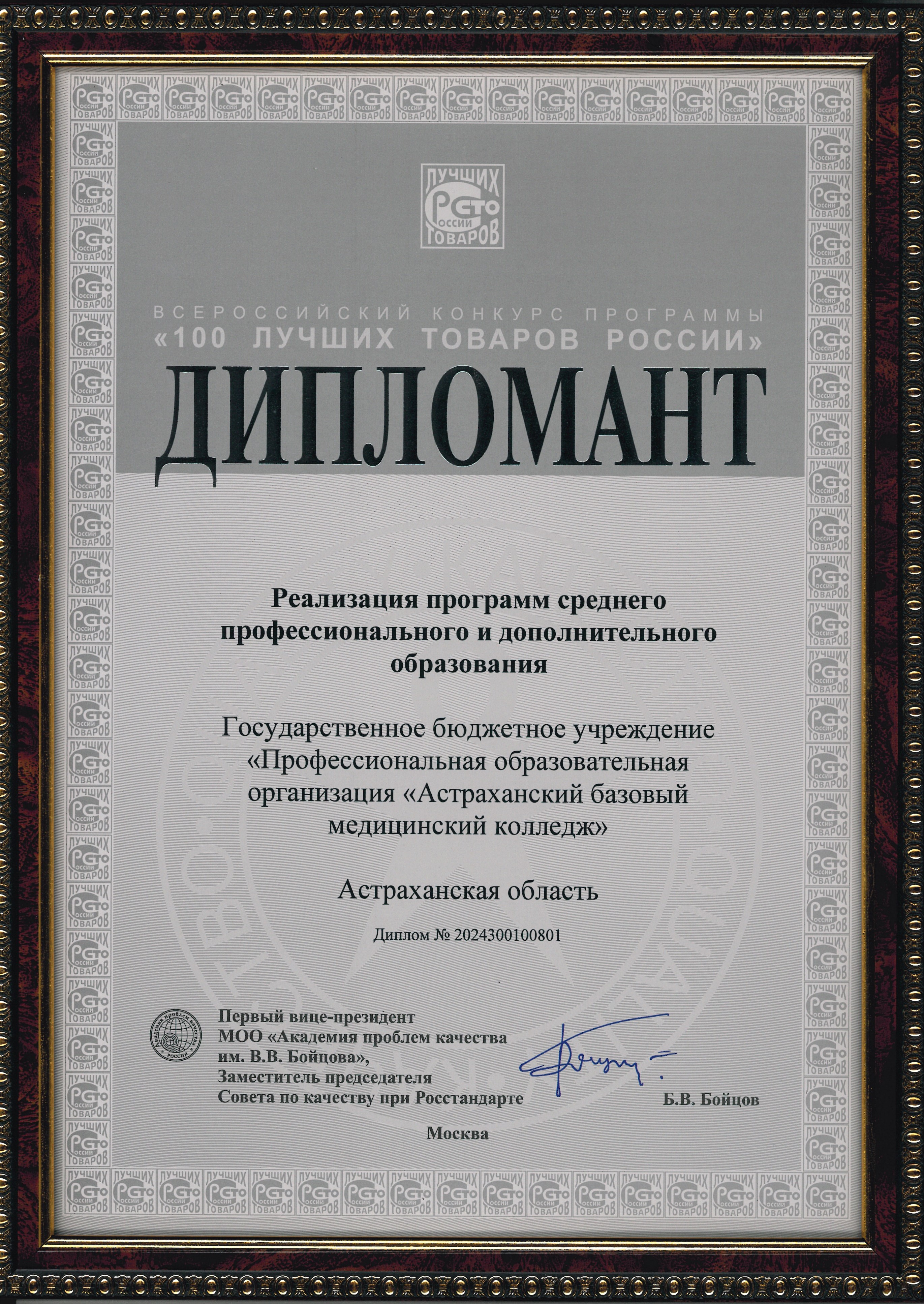 Победители регионального этапа представят Астраханскую область на всероссийском конкурсе программы «100 лучших товаров России», где наш колледж уже принимал участие в 2024 году и стал дипломантом в номинации «Услуги для населения».Конкурс проходил в стенах Астраханского базового медицинского колледжа .
